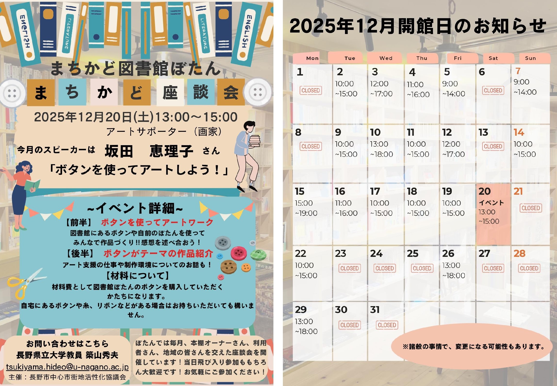 まちかど図書館ぼたんでは、毎月、本棚オーナーさん、利用者さん、地域の皆さんを交えた座談会を開催しています!第13回目となる今年最後の12月の予定はこちらです!