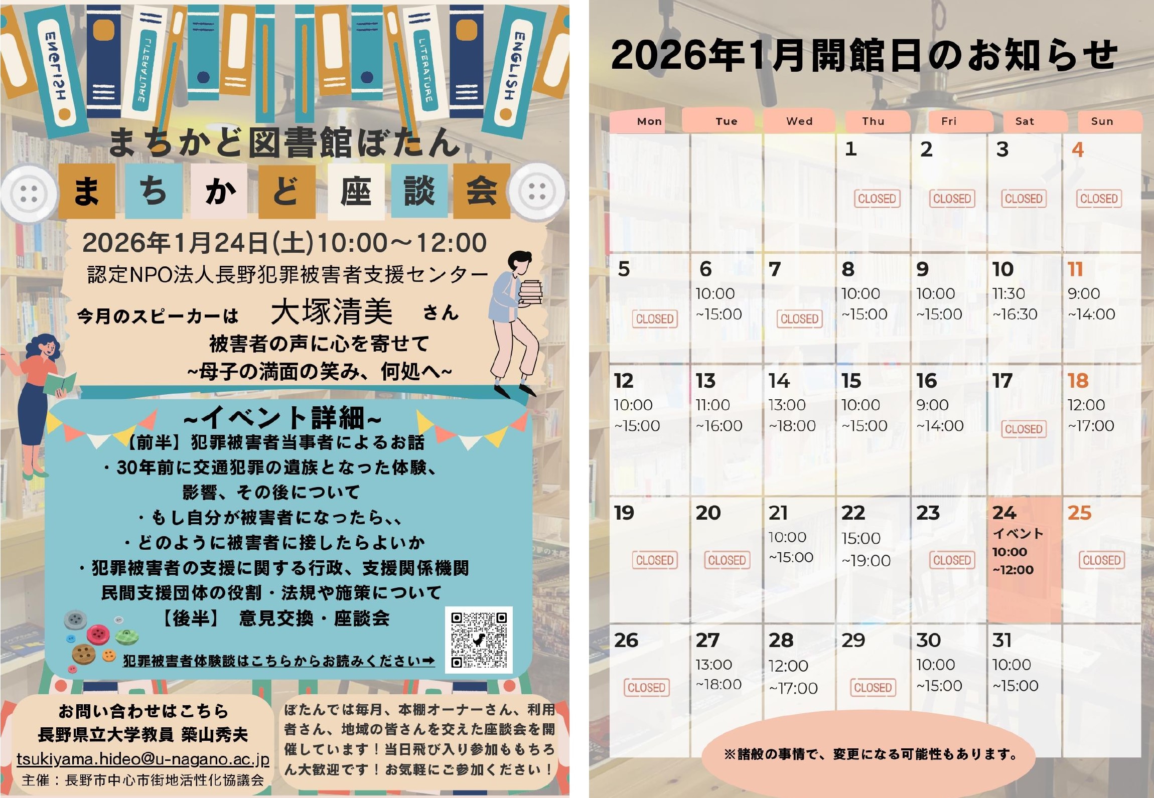 まちかど図書館ぼたんでは、毎月、本棚オーナーさん、利用者さん、地域の皆さんを交えた座談会を開催しています!第14回目となる今年最初の1月の予定はこちらです!